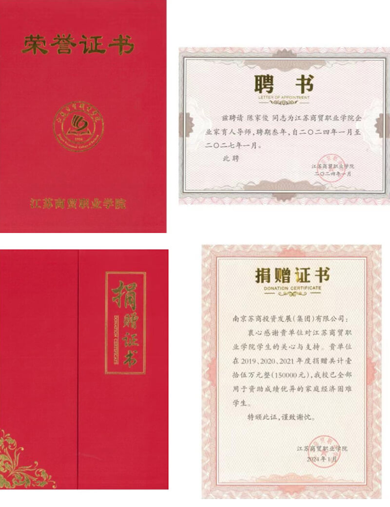 ↑馮志明書記(左)為陳家俊董事長頒發(fā)榮譽(yù)證書和“蘇商獎(jiǎng)學(xué)金”捐贈(zèng)證書