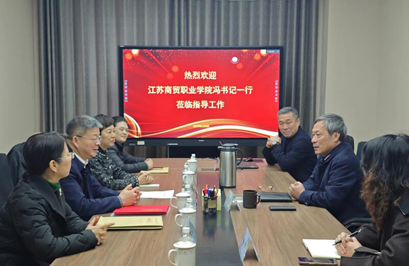 2024年1月8日下午,江蘇商貿(mào)職業(yè)學(xué)院黨委書記馮志明先生一行四人專程來到蘇商集團(tuán)本部指導(dǎo)交流工作,集團(tuán)董事長陳家俊先生熱情接待了馮書記一行。
