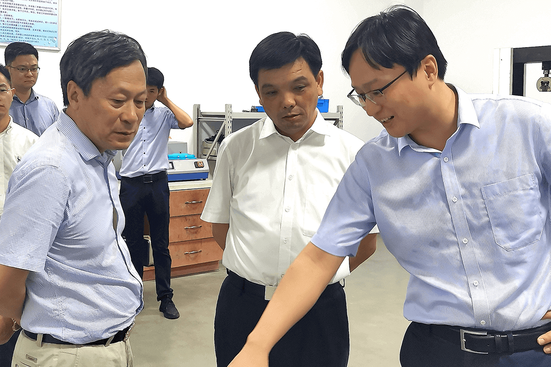 ↑蘇商集團(tuán)陳家俊董事長(左)和副總經(jīng)理陳寅同志(右)陪同南京江寧濱江開發(fā)區(qū)黨工委萬振華書記(中)參觀南京金城軌道公司產(chǎn)品實驗室。